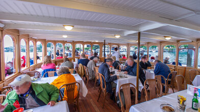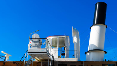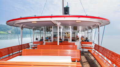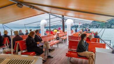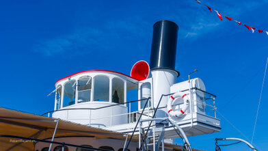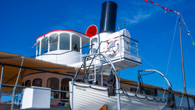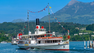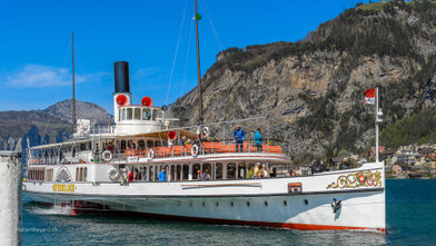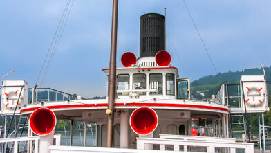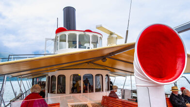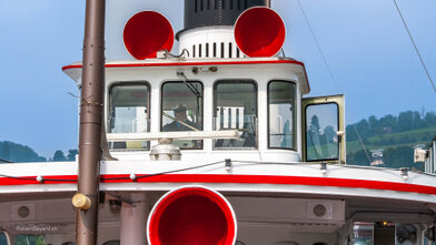 Mit versenkbarem Masten, Kamin und Steuerhaus in den Alpnachersee.