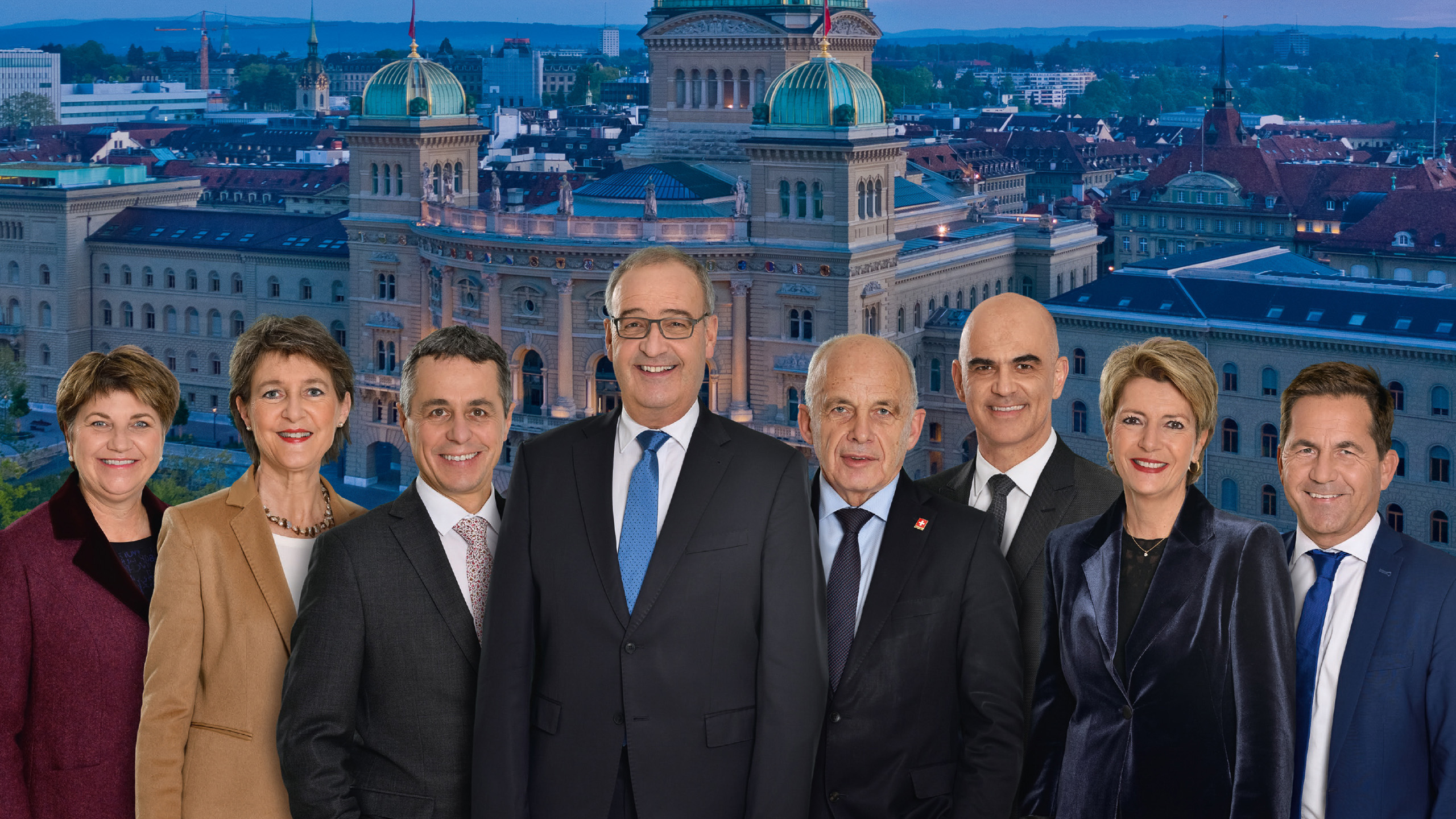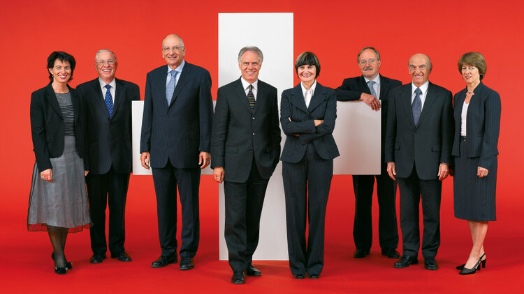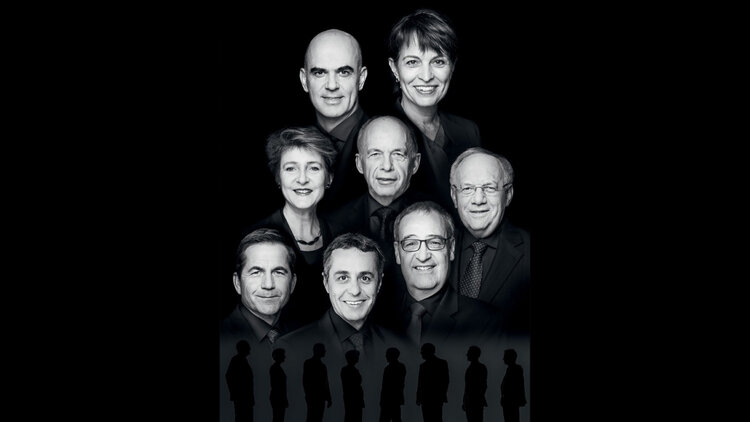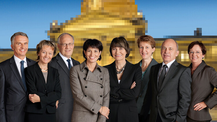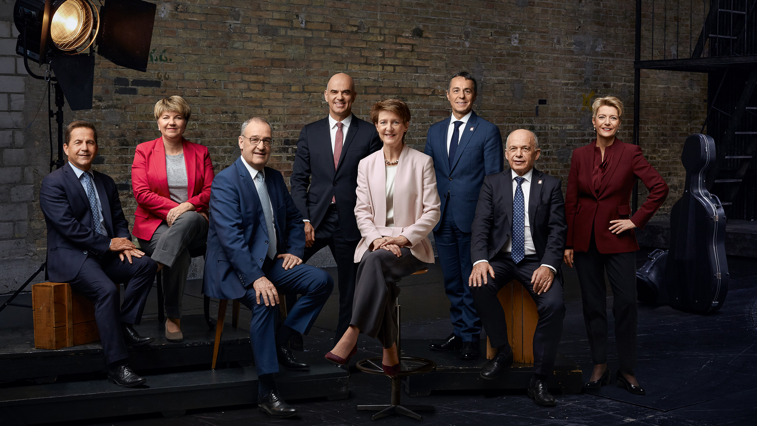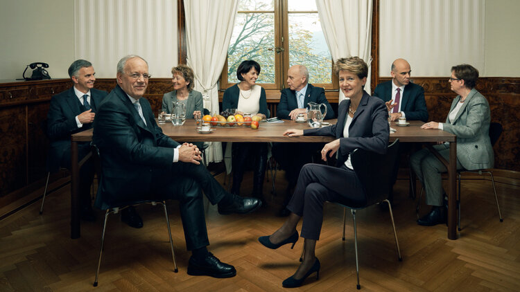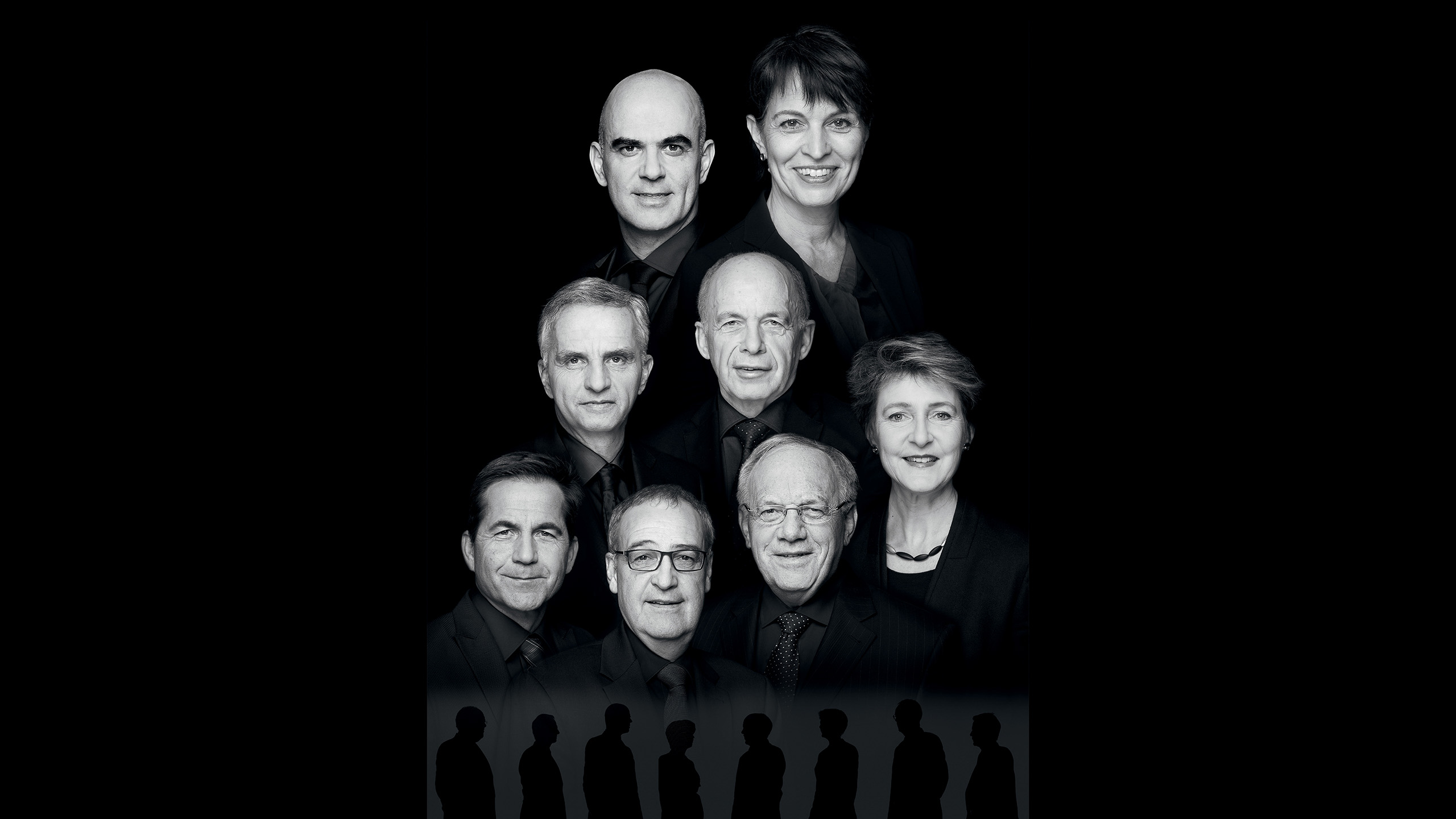 Der Bundesrat besteht aus sieben gleichberechtigten, von der Vereinigten Bundesversammlung fest auf vier Jahre gewählten Mitgliedern. Jedes Mitglied steht einem Eidgenössischen Departement vor, jedoch sind alle Mitglieder für die Regierungsarbeit gemeinsam verantwortlich. Zwei Mitglieder sind jeweils für die Dauer von einem Jahr Bundespräsident und Vizepräsident. Der Bundespräsident leitet die Sitzungen des Bundesrats, die in der Regel im Bundeshaus in Bern stattfinden.