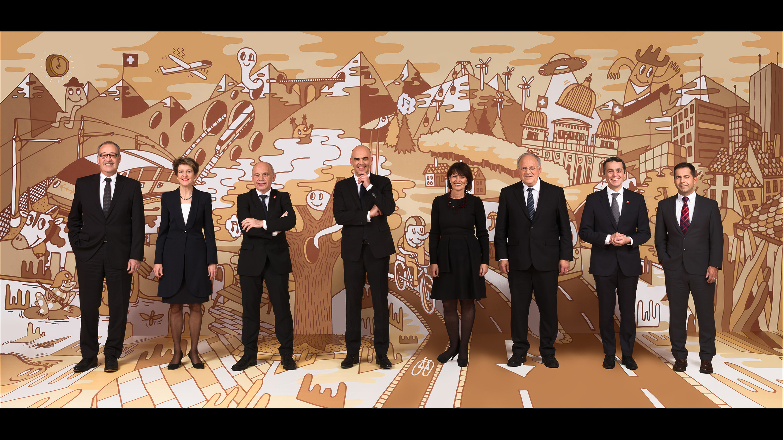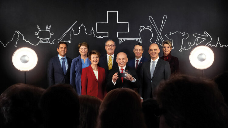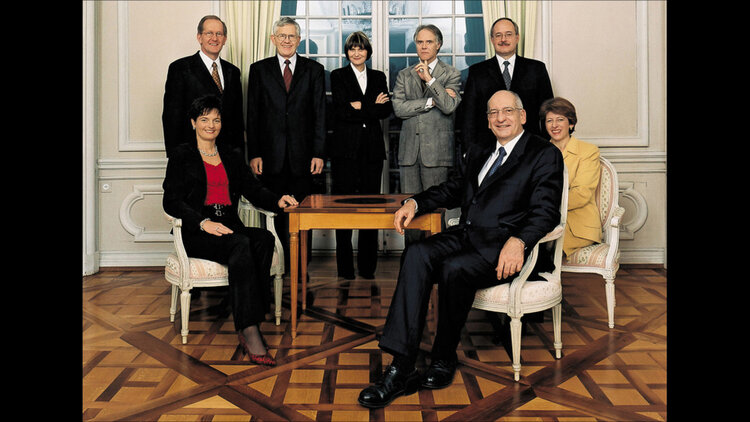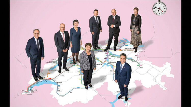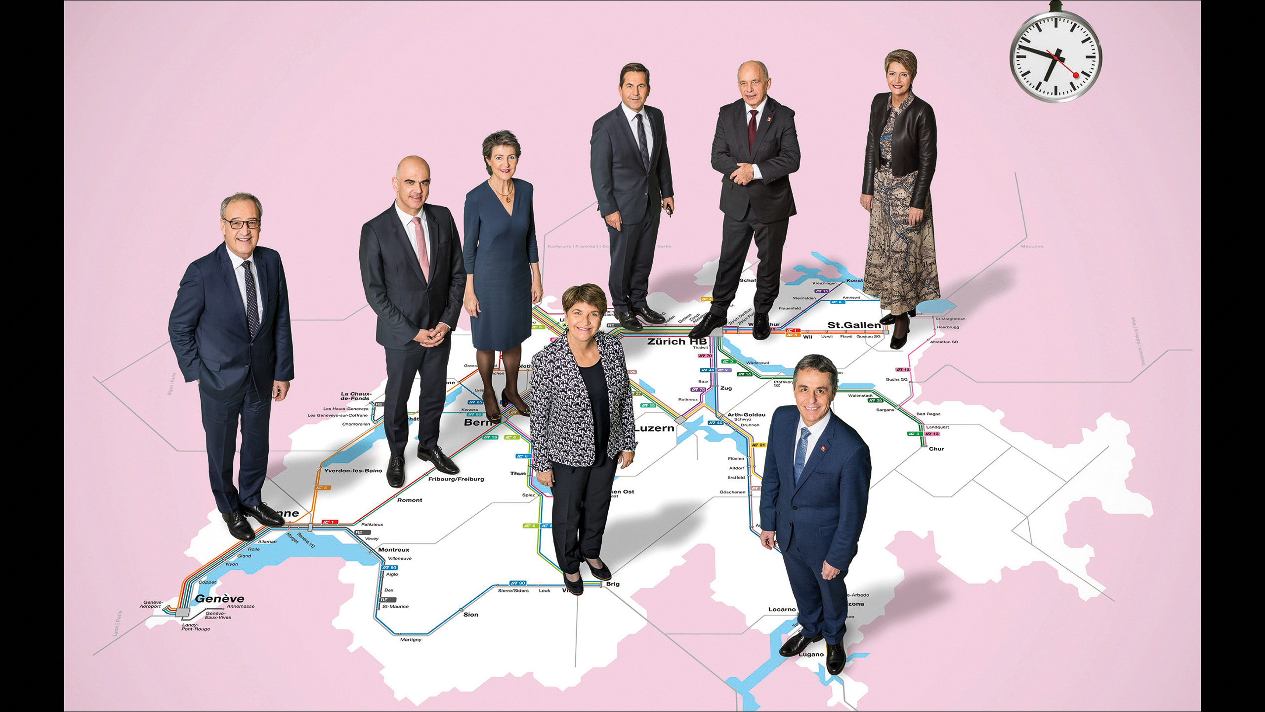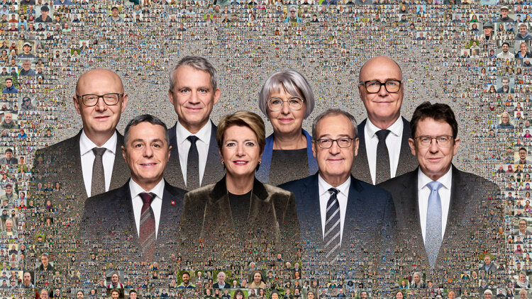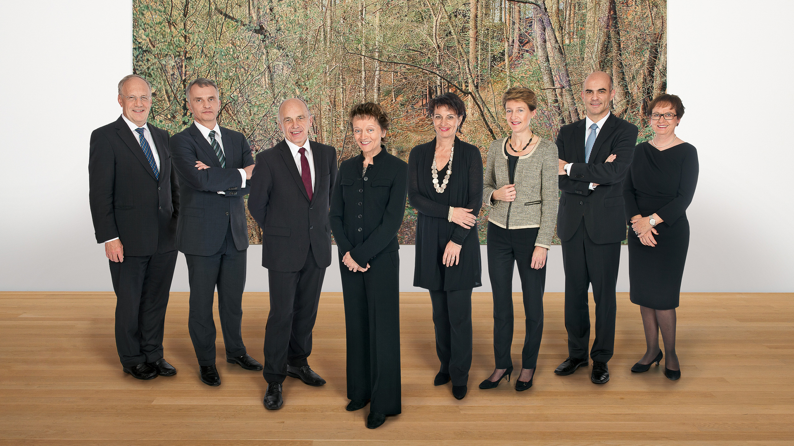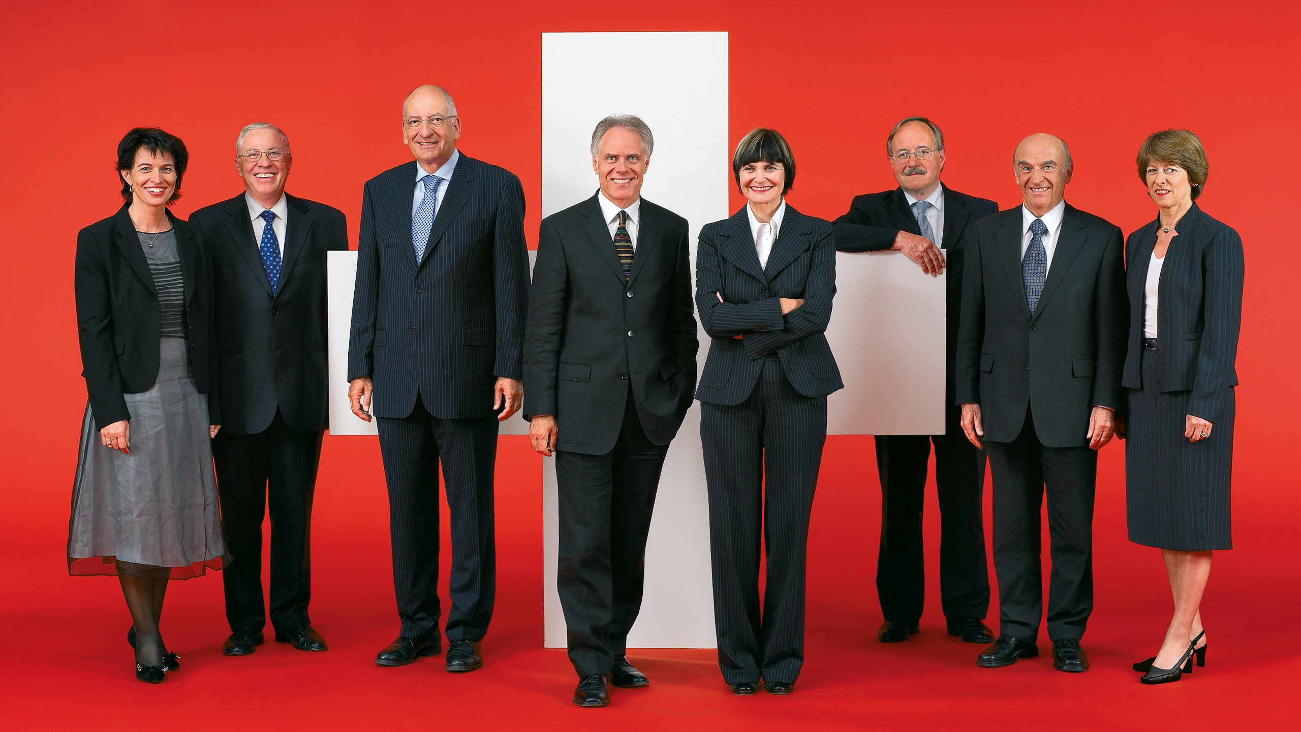 Der Bundesrat besteht aus sieben gleichberechtigten, von der Vereinigten Bundesversammlung fest auf vier Jahre gewählten Mitgliedern. Jedes Mitglied steht einem Eidgenössischen Departement vor, jedoch sind alle Mitglieder für die Regierungsarbeit gemeinsam verantwortlich. Zwei Mitglieder sind jeweils für die Dauer von einem Jahr Bundespräsident und Vizepräsident. Der Bundespräsident leitet die Sitzungen des Bundesrats, die in der Regel im Bundeshaus in Bern stattfinden.