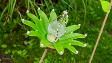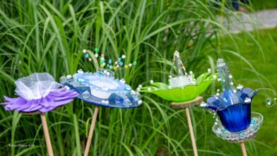 Kunstobjekte, die von grossen und kleinen Künstlern aus der Bevölkerung geschaffen wurden, verwandeln den Garten der Ermitage in ein zauberhaftes Blumenmeer.