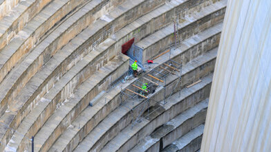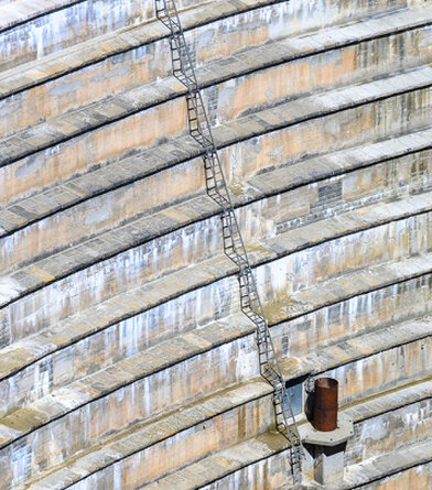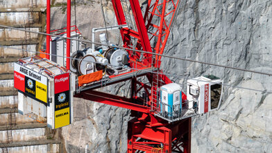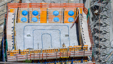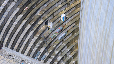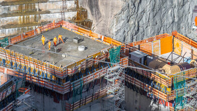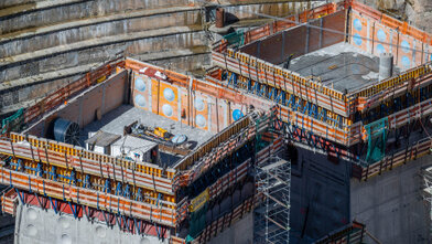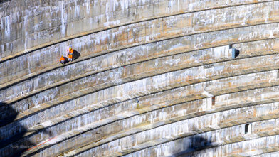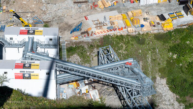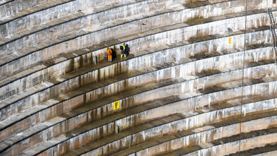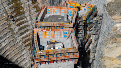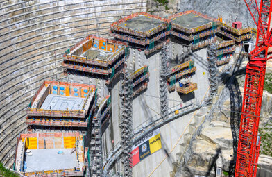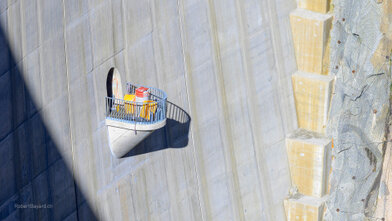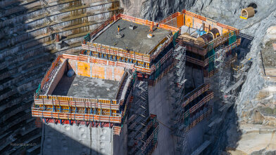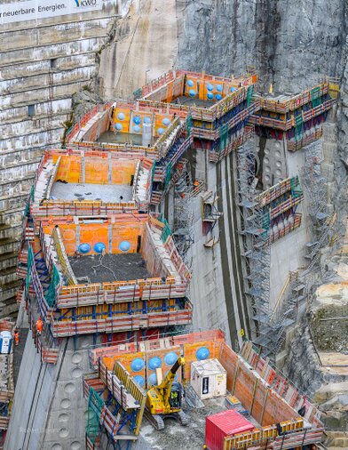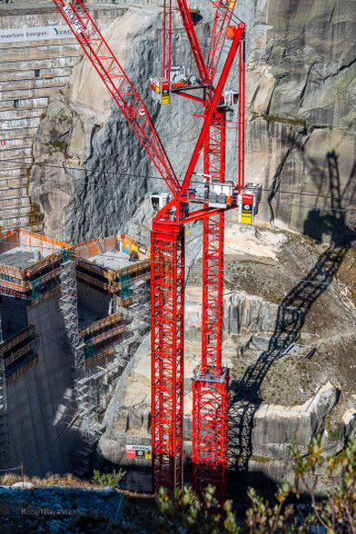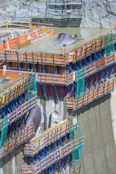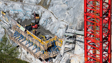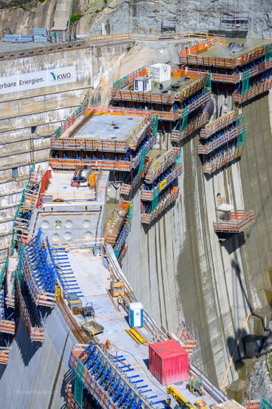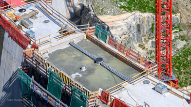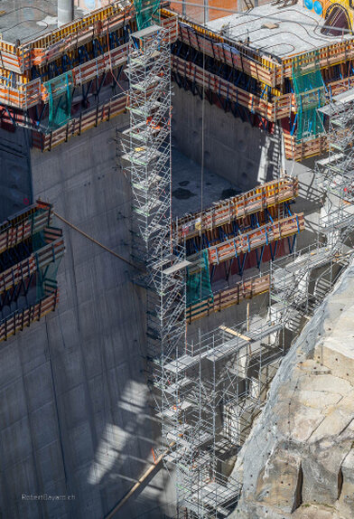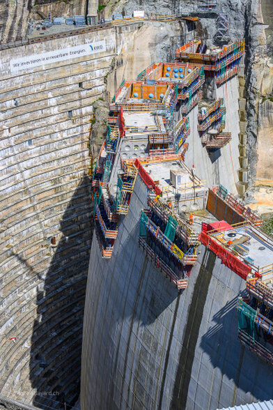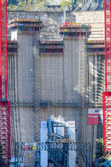 In der Bausaison 2021 haben die Betonarbeiten und damit der eigentliche Bau der Mauer begonnen. Die technischen Anforderungen für Staumauerbeton sind hoch. In aufwändigen Verfahren vor Ort und in Labors wird in drei Versuchsreihen die richtige Mischung des Betons definiert. Die Zuschlagstoffe, das heisst der Kies für die rund 520'000 Tonnen Beton, die letztlich verbaut werden, stammen einerseits von der nahegelegenen Kiesdeponie an der Gerstenegg aus dem Bau des Kraftwerks Grimsel 2 und andererseits aus dem abgetragenen Material der Spitallamm Baustelle. Das Material wird zerkleinert, gewaschen, sortiert und als Betonzuschlagsstoff wiederverwendet. Gemischt wird der Beton unmittelbar vor der bestehenden Staumauer in den beiden grossen, weissen Betonanlagen. In einzelnen, versetzten Quadern wird die Mauer dann in die Höhe wachsen. Anders als die bisherige Mauer wird die neue keine Stufen aufweisen, sondern an der Oberfläche glatt sein. In der Bausaison werden rund 60 Arbeiter, in der Regel in zwei Schichten, an der neuen Staumauer arbeiten.