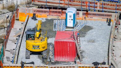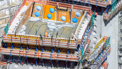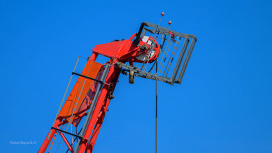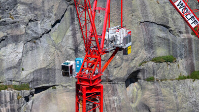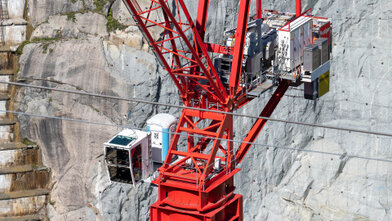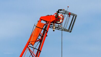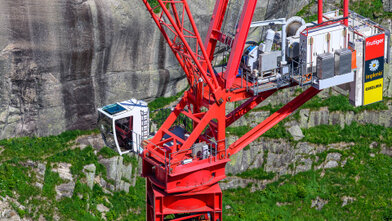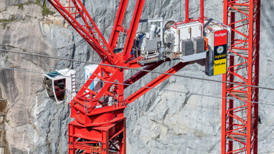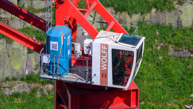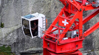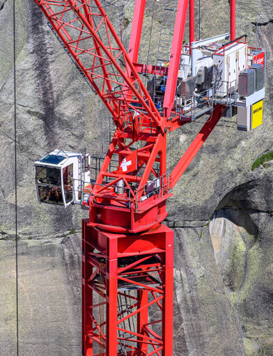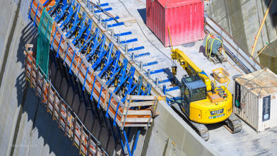 Auf der Baustelle sind auch zwei Kräne der Superlative im Einsatz. Höhe der Kräne 92 m, mit den Auslegern kommen sie auf 160 m! Beachten Sie auch auf den Fotografien, dass die Kranführer auf ca. 80 m Höhe eigene WC haben! 🤣
