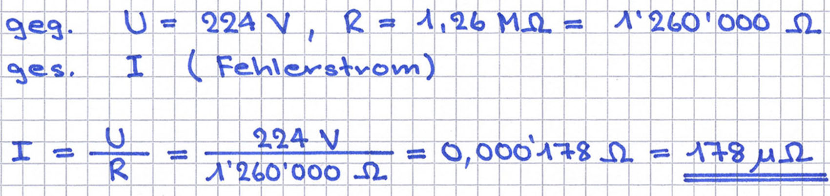 An einem Wärmegerät herrscht zwischen der Heizwicklung und der geerdeten Masse eine Spannung von 224 V. Der Isolationswiderstand ist 1,26 MΩ.