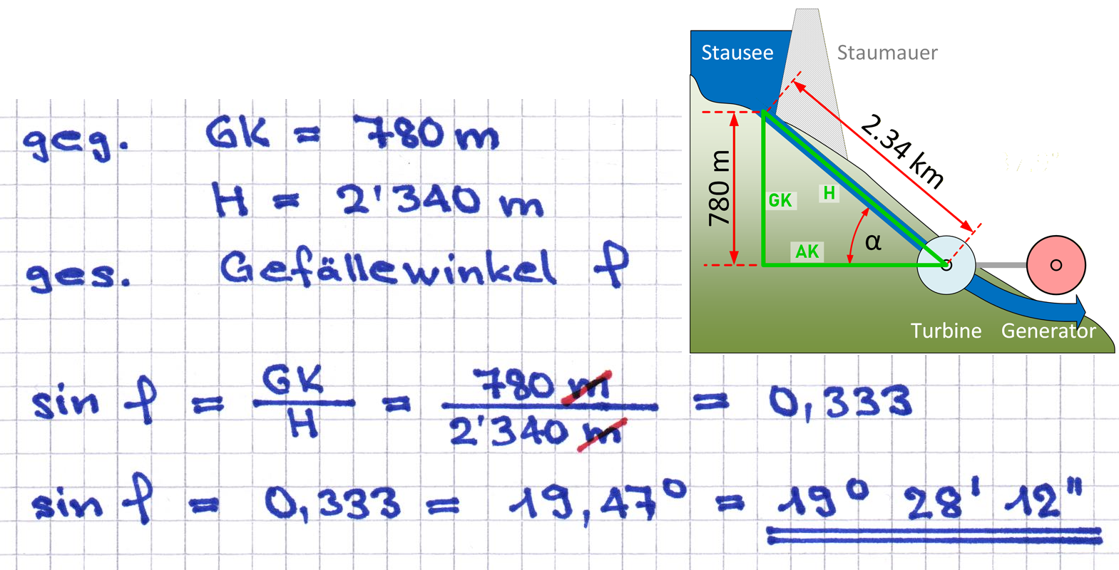 Berechnen Sie den Gefällewinkel des Stollens!