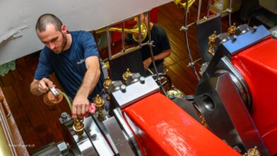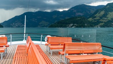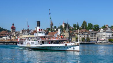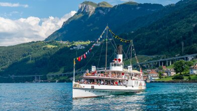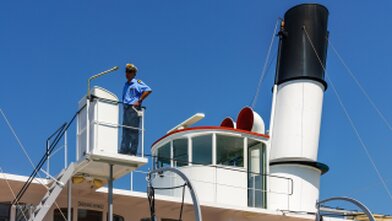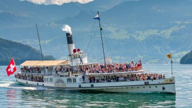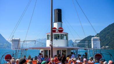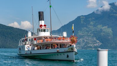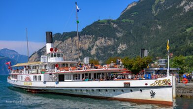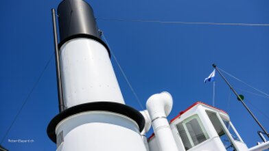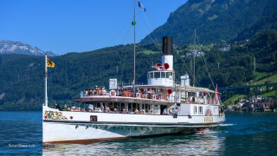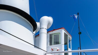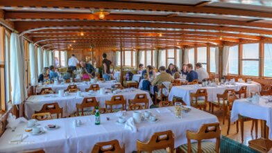 Der klassische Raddampfer mit dem einzigartigen Salon im geometrieschen Jugendstil.