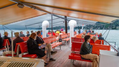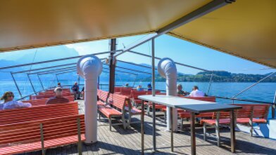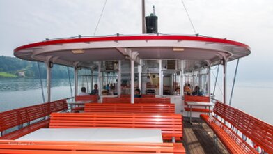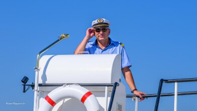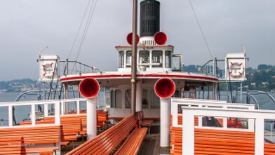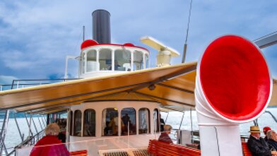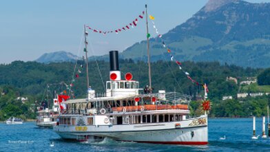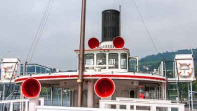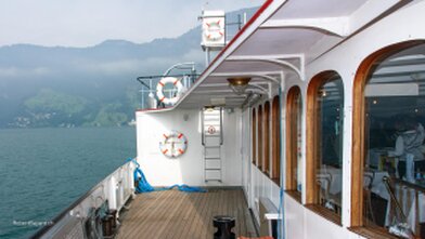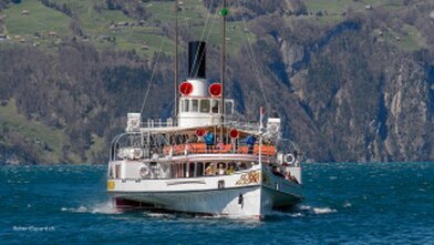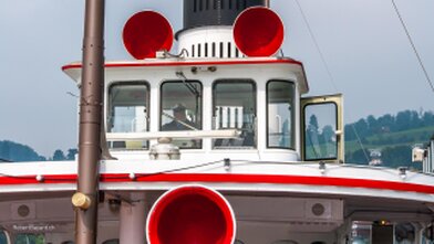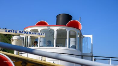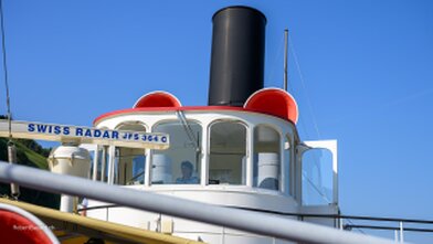 Mit versenkbarem Masten, Kamin und Steuerhaus in den Alpnachersee.