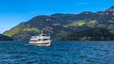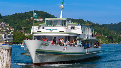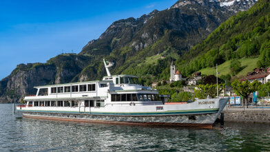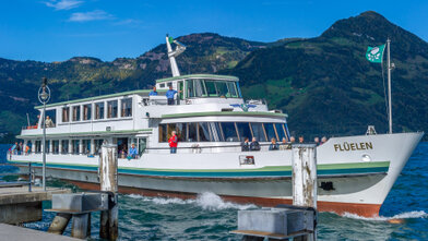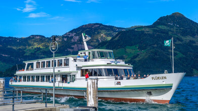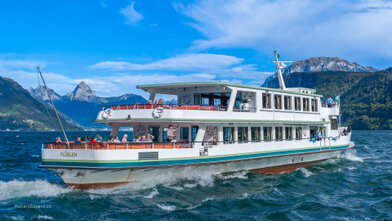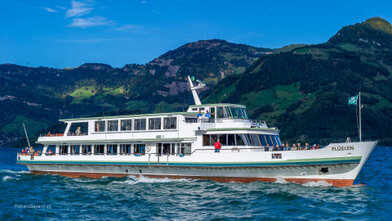 Die «Flüelen» ist reich ausgestattet mit künstlerischem Schmuck. Die Skulptur «Stehruderer» befindet sich im Eingangsbereich zum Oberdecksalon, und zwei Messing-Wandrelief mit Darstellungen vom Urnersee und dem Ort Flüelen zieren den Panorama-Salon. Alle drei Werke stammen vom Künstler Toni Walker aus Flüelen. Am 1. Februar 1991 kommt es erstmals in der Geschichte der Vierwaldstättersee-Schifffahrt zu einer Doppel-Jungfernfahrt mit MS Brunnen.